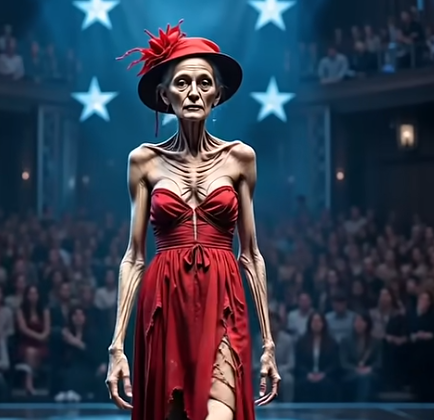 She appeared fragile, almost weightless, her thin frame draped in a crimson dress that swayed like liquid fire with each step. A red hat crowned her silver hair, tilted elegantly to the side, its delicate feather trembling under the soft hum of the lights.