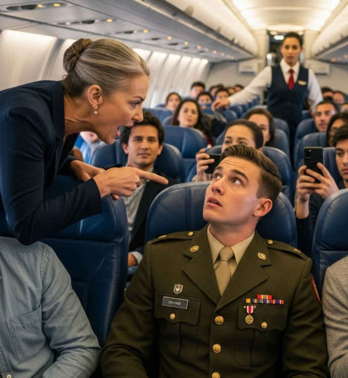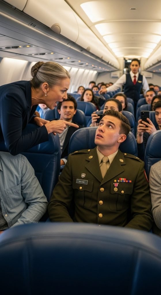 The young soldier’s silence only deepened the guilt written across his face. He turned slightly toward the window, staring into the clouds outside. The rest of the cabin remained silent—passengers uncomfortable, yet no one dared to intervene.