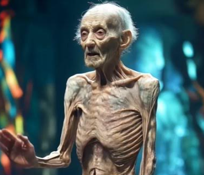 An elderly man stepped onto the stage, his frail frame almost ghostlike beneath the blinding lights. His shoulders were thin, his ribs visible, his skin weathered like ancient parchment. Barefoot and silent, he moved with quiet steps, his expression unreadable — a mixture of exhaustion and infinite calm.