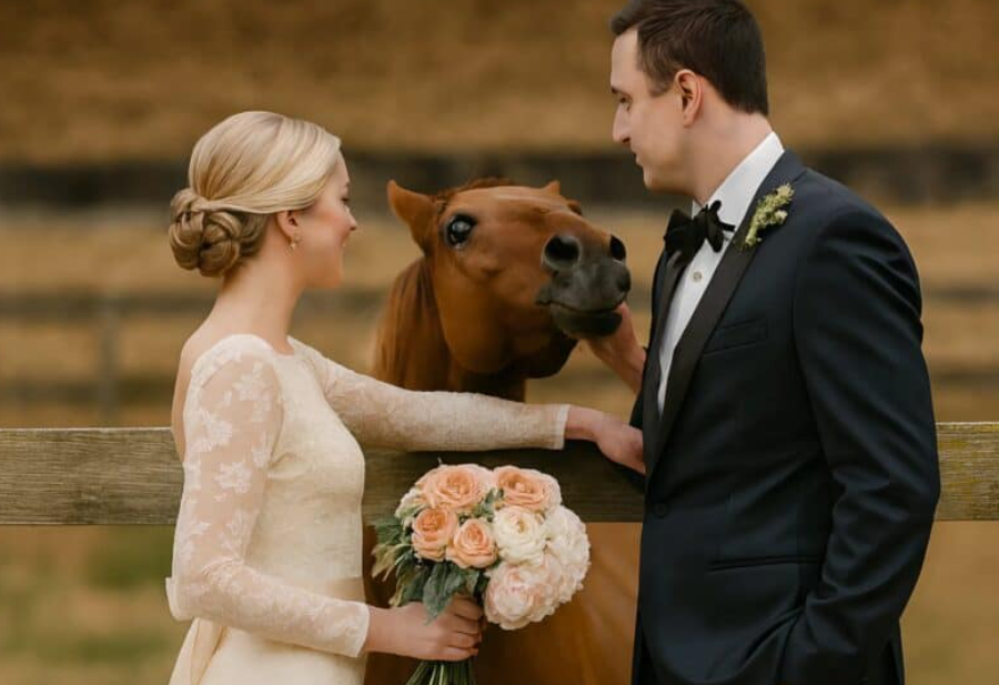 My groom didn’t mind the idea — on the contrary, he said photos with a horse would be very unique and romantic. Everything was perfect: a gentle breeze, the morning light, the photographer giving directions. But as soon as we approached the fence and stood next to the horse, she suddenly began to neigh loudly, stomp, shake her head, and even push my groom in the chest with her muzzle.