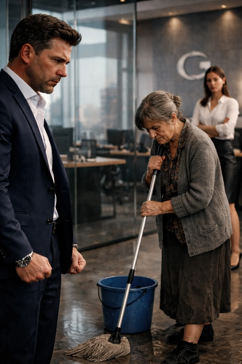 In the middle of the modern office, surrounded by glass walls, spotless desks, and expensive furniture, he saw a scene he never could have imagined. His mother was there. Holding a bucket of water and a mop, cleaning the floor as if she were invisible to everyone around her.